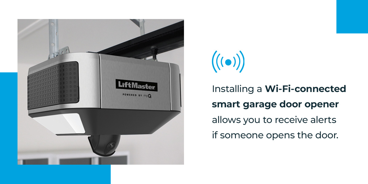 - Upgrade to a smart garage door opener: Installing a Wi-Fi-connected smart garage door opener allows you to receive alerts if someone opens the door.